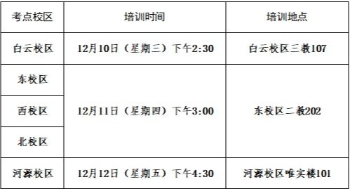 请各位监考员与相关考试工作人员依时参加培训(白云校区监考员尽量参加星期三白云校区培训),北校区监考员去白云校区参加培训时,在满足上课老师乘坐校车的前提下如有空座可乘坐,如无空座需自行安排前往。具体培训时间和地点如下: